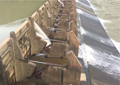 翻板壩阻水,經不住洪水的沖擊,易被漂浮物卡塞或上游淤積造成不能自動翻板,容易被洪水沖壞壩體影響防洪安全。洪水過后翻板門再關上時被異物卡住,造成大量漏水,一旦淤積厚度較大或泥沙板結,閘門就不能正?;亻T(眾多閘門中只要有一扇),將影響河道正常蓄水。汛期漂浮物(特別是樹枝)經??ㄗ¢l門導致起翻或回落困難,威脅到行洪安全。